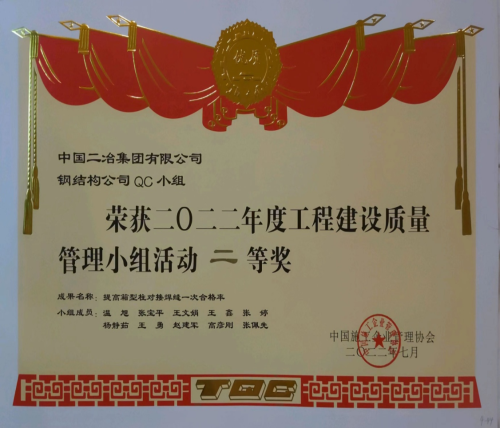 7月25日,由中國施工企業(yè)協(xié)會舉辦的“2022年工程建設(shè)質(zhì)量管理小組競賽活動”在海南博鰲舉辦。會上,由中國二冶報送的《提高箱型柱對接焊縫一次合格率》QC成果,經(jīng)過層層篩選和專家評審,最終榮獲2022年度全國工程建設(shè)優(yōu)秀質(zhì)量管理小組二等獎。