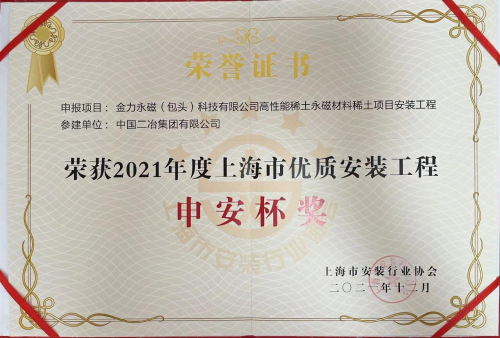 中國二冶金力永磁項目安裝工程首次獲得上海市優(yōu)質(zhì)安裝工程“申安杯”獎