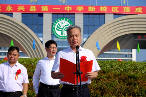 揭牌儀式首先由永興一中校長(zhǎng)胡兆文致辭。他指出,永興一中項(xiàng)目建設(shè)是造福當(dāng)?shù)匕傩盏囊豁?xiàng)重大民生工程,是功在當(dāng)代,利在千秋的一件大事。他希望學(xué)生們心懷天下做有家國(guó)情懷的人,意志堅(jiān)韌做積極進(jìn)取的人,心胸開闊做陽(yáng)光大度的人,心存善意做助人為樂(lè)的人。最后,他祝學(xué)生們?cè)谛碌膶W(xué)校快樂(lè)成長(zhǎng)。