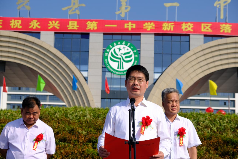 劉朝暉在致辭中首先代表縣委、縣人大、縣政府、縣政協(xié),向夜以繼日奮戰(zhàn)的中國(guó)二冶施工人員、項(xiàng)目指揮部工作人員和承建單位表示衷心感謝!廣大建設(shè)者克服了重重困難,歷經(jīng)了千辛萬(wàn)苦,全體參與項(xiàng)目建設(shè)的同志們發(fā)揚(yáng)“三牛”精神,吃苦耐勞,攻堅(jiān)克難,奮戰(zhàn)1300多個(gè)日日夜夜,終于建成了一座占地400畝、學(xué)位6000個(gè)的現(xiàn)代化新高中,向全縣人民兌現(xiàn)了莊嚴(yán)承諾,也讓70萬(wàn)永興人民充分感受到縣委縣政府致力于改善民本民生的堅(jiān)定決心。他強(qiáng)調(diào),優(yōu)質(zhì)教育質(zhì)量的均衡發(fā)展一直是困擾當(dāng)?shù)乜h鄉(xiāng)兩級(jí)教育事業(yè)發(fā)展的一個(gè)難題。今天新校區(qū)的揭牌意味著永興一中即將揚(yáng)帆遠(yuǎn)航,永興一中要以揭牌和開學(xué)為新起點(diǎn),瞄準(zhǔn)高標(biāo)準(zhǔn),高質(zhì)量,高品位目標(biāo),提高教育質(zhì)量,辦出教育品牌,努力把學(xué)校創(chuàng)辦成管理一流,特色鮮明的義務(wù)教育標(biāo)桿學(xué)校。